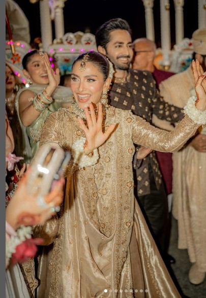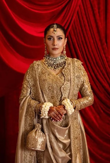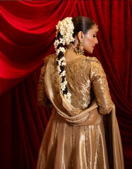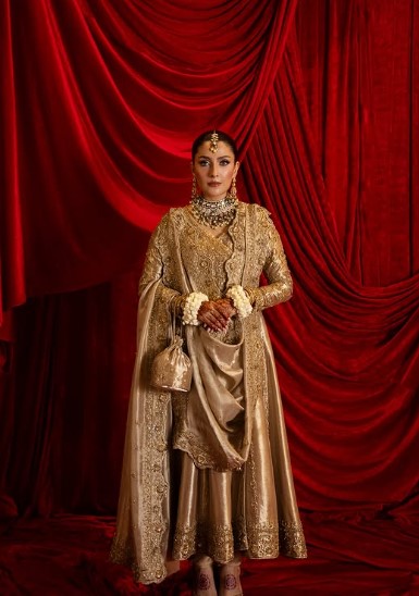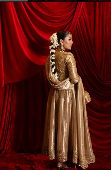 Pakistan’s traditional hand embroidery has always been admired worldwide. The zardosi work on this Golden Anarkali is reminiscent of Mughal artistry, where luxury met cultural heritage. Because of its intricate detailing and glimmering embellishments, the outfit transforms ordinary moments into royal memories. Moreover, every embellishment — from the smallest crystal to the grandest motif — is sewn by hand with love and precision.