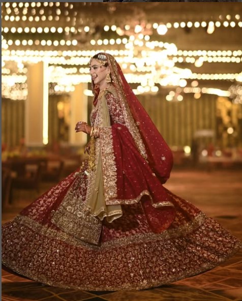 Blending Pakistani–Indian Bridal Collection elegance with Indian luxury, this lehenga features a muted red base and golden mirror work. The flare flows gracefully, giving a regal aura.