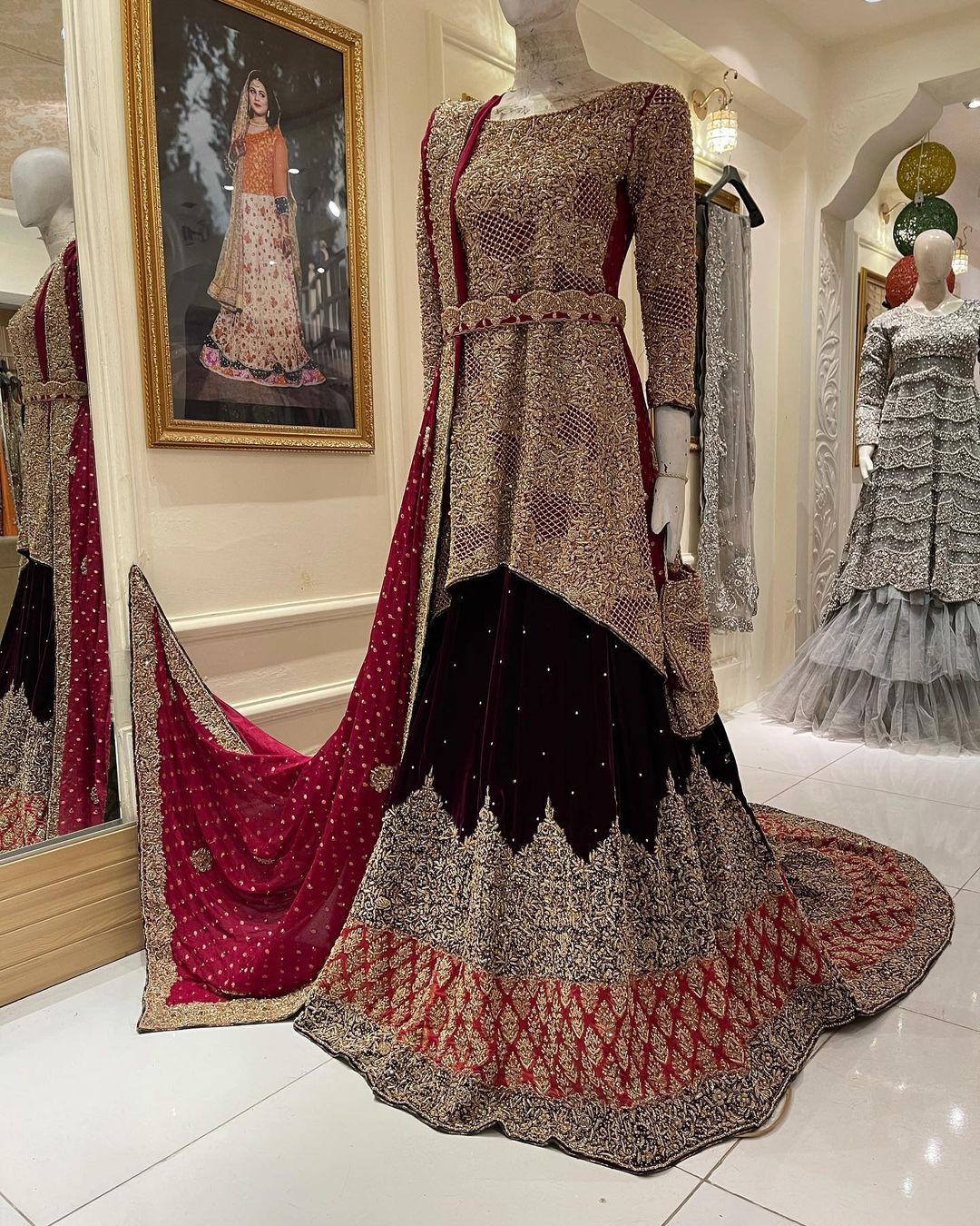 Deep maroon bridal dress along with a long back trail velvet lehnga fully hand embroidered.