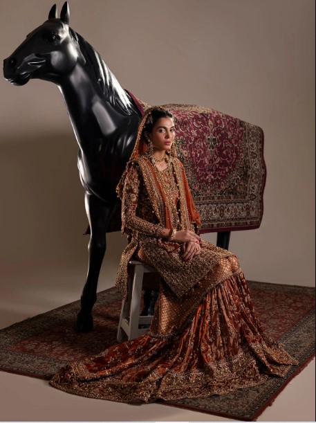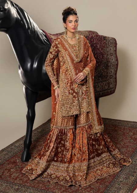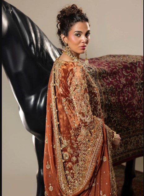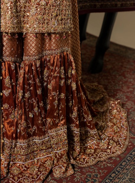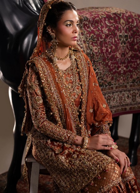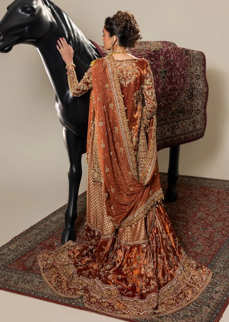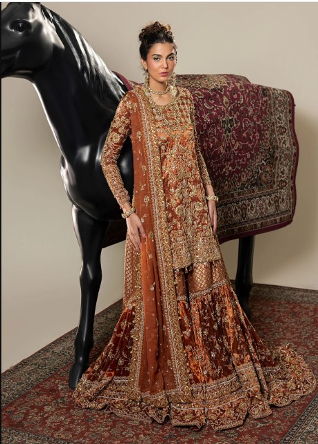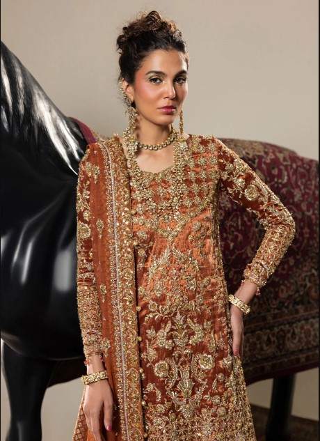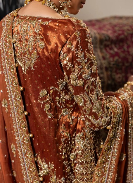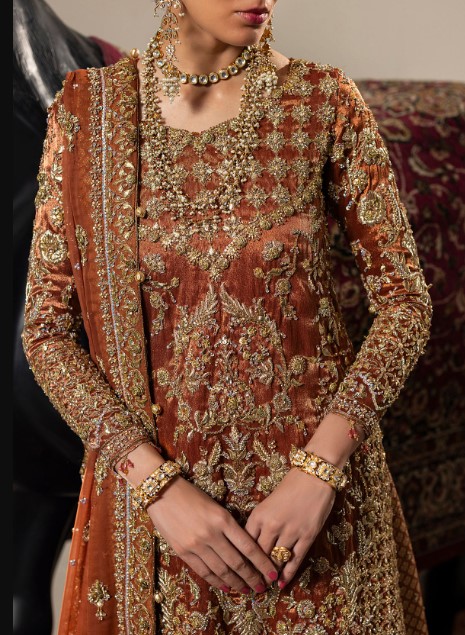 Step into timeless elegance with this luxurious burnt orange Pakistani bridal lehenga set, crafted to perfection for brides who love royal and traditional aesthetics. This stunning outfit showcases intricate hand embroidery with zardosi, dabka, naqshi, and sequins, making it a perfect choice for weddings, receptions, or grand festive occasions.