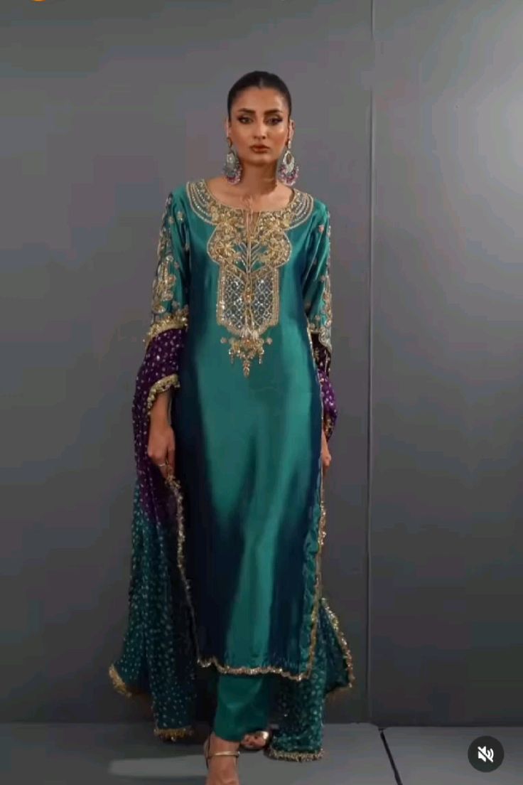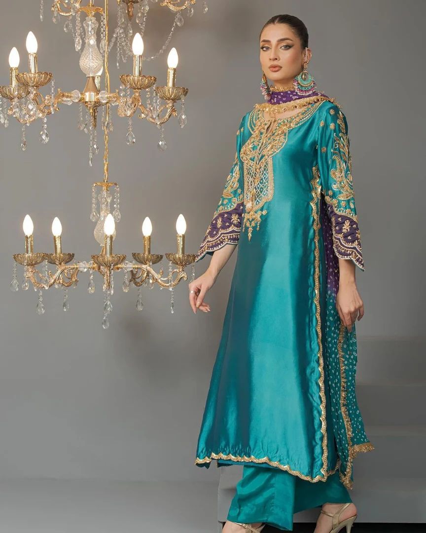 Crafted in a rich teal shade with intricate zari, zardozi, and dabka hand embroidery, this suit is perfect for wedding ceremonies like mehndi, nikkah, engagement, reception, and sangeet. The detailed neckline work and heavily embroidered sleeves create a majestic look that instantly enhances your presence.