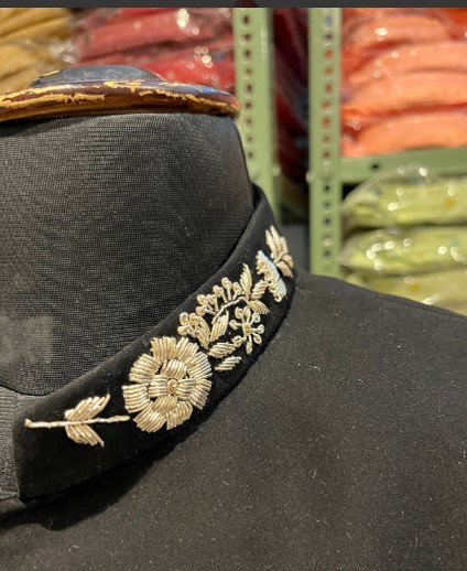 The hand-embroidered crest on the chest represents regal heritage. Furthermore, the detailed motif adds character without overpowering the look.